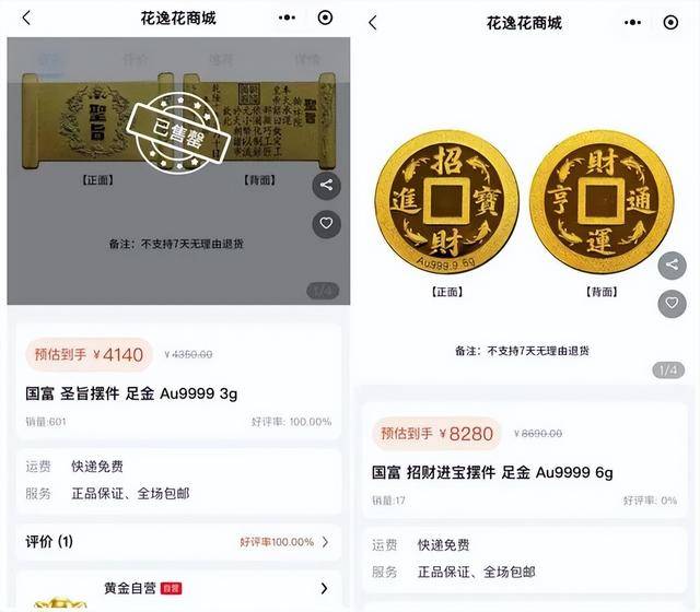 今年1月下旬,记者查看众花优选商城,发现该商城上“国富足金摆件”显示已经售罄,销量超过600件。另一款在售的6克规格的国富足金摆件售价为8280元。截至发稿,众花优选商城则已对所有黄金饰品类商品进行了下架。