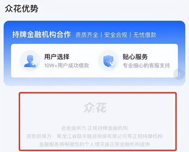 在平台金融服务提供方面,众花明确标注贷款担保方为黑龙江省联丰融资担保有限公司等机构。据官网介绍,黑龙江省联丰融资担保有限公司成立于2018年,注册资本10.5亿元,是一家国资控股企业,主要开展消费金融、普惠金融、传统担保业务、绿色金融以及产业金融业务。经过6年的发展,公司与20多家银行、金融机构开展担保业务合作。