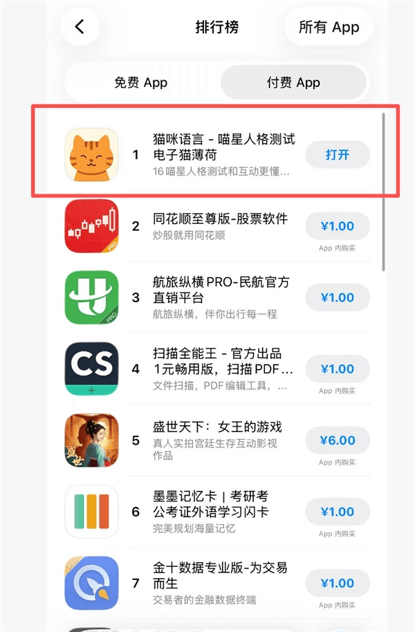 2 月 9 日消息,主打人猫互动的「猫咪语言」APP 成现象级爆款,登顶苹果 App Store 付费榜且高热态势已持续半月,目前稳居付费榜第二。