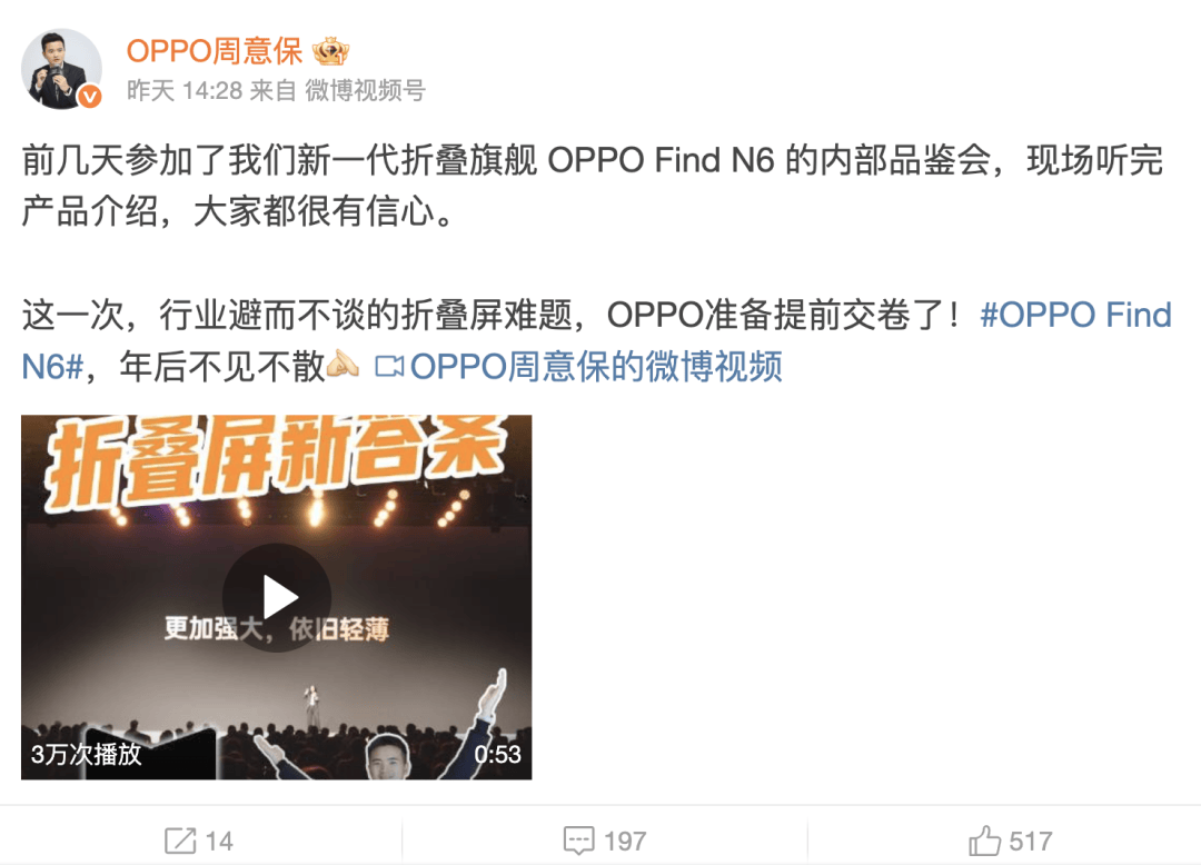 此前,OPPO Find 系列产品负责人周意保透露,Find N6 折叠屏手机年后不见不散,主打「更加强大,依旧轻薄」特性。