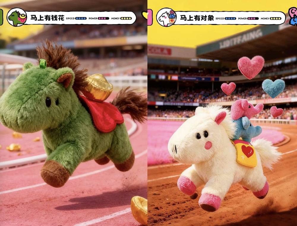而除了“哭哭马”,市场上还陆续出现了“高冷马”“抽象马”“干饭马”等各具个性的设计,这些产品凭借独特的情绪表达,与消费者建立了更直接的情感链接。淘宝天猫玩具潮玩行业运营人员表示,相比写实风格、肌肉线条明显的“骏马”造型,这届年轻人更愿意买一只看着软萌、甚至带点“小脾气”的马。还有“马上有钱花”“马上有对象”等趣味标语,精准触动了年轻群体的情感需求。