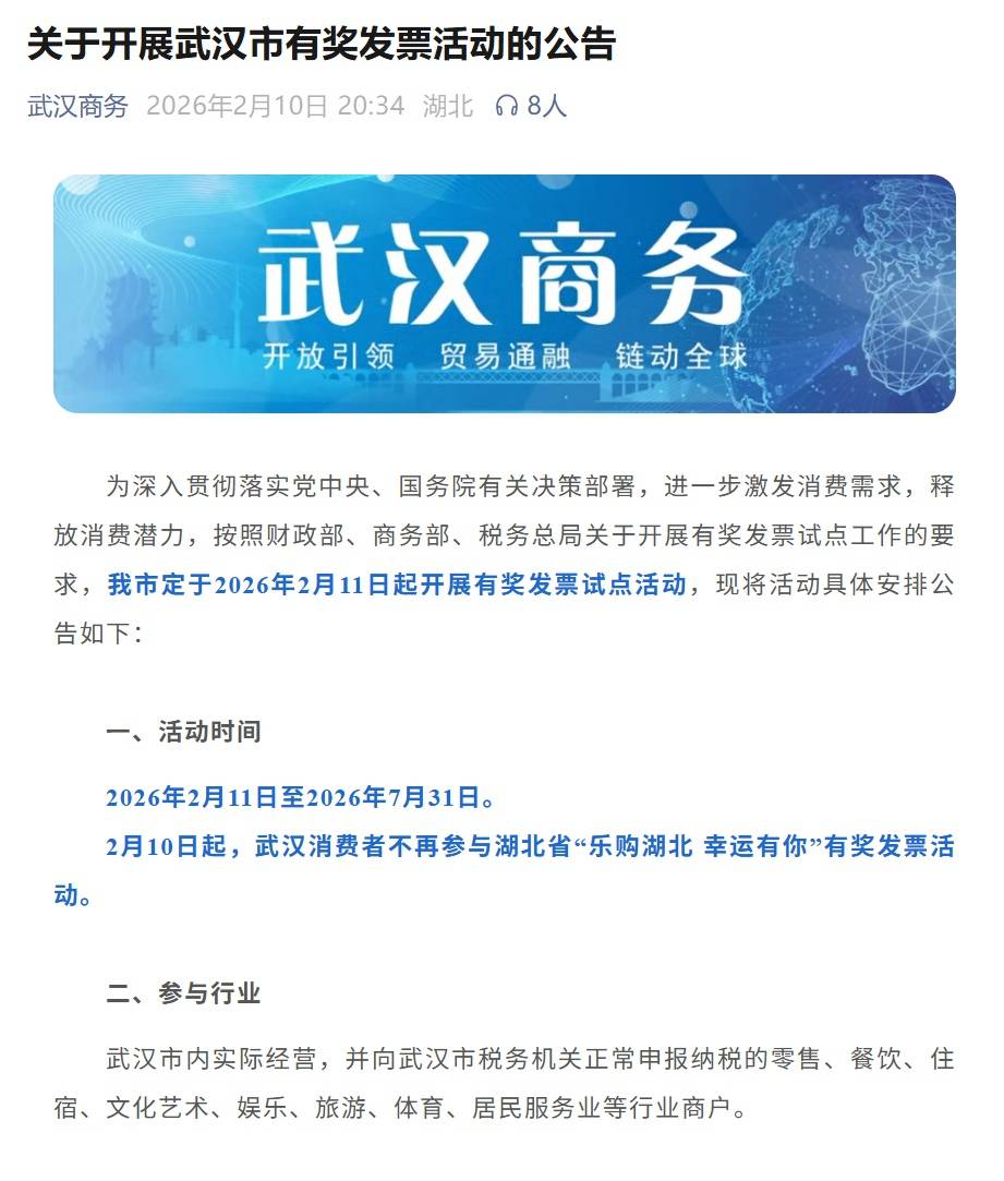 2月10日,武汉市商务局发布《关于开展武汉市有奖发票活动的公告》,为激发消费潜力,武汉市将于2026年2月11日至7月31日开展有奖发票试点活动。活动期间,个人消费者在武汉符合条件的商户消费并开具指定电子发票,即可参与抽奖,有机会获得10元至800元不等的即开奖金,并自动进入月度定期抽奖池。本次活动由财政部、商务部、税务总局统一部署,武汉市配套组织。