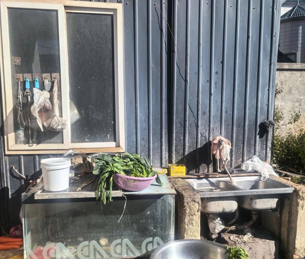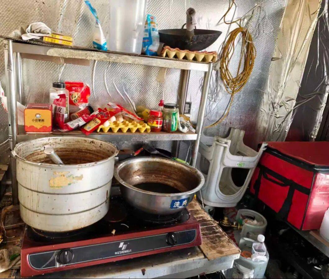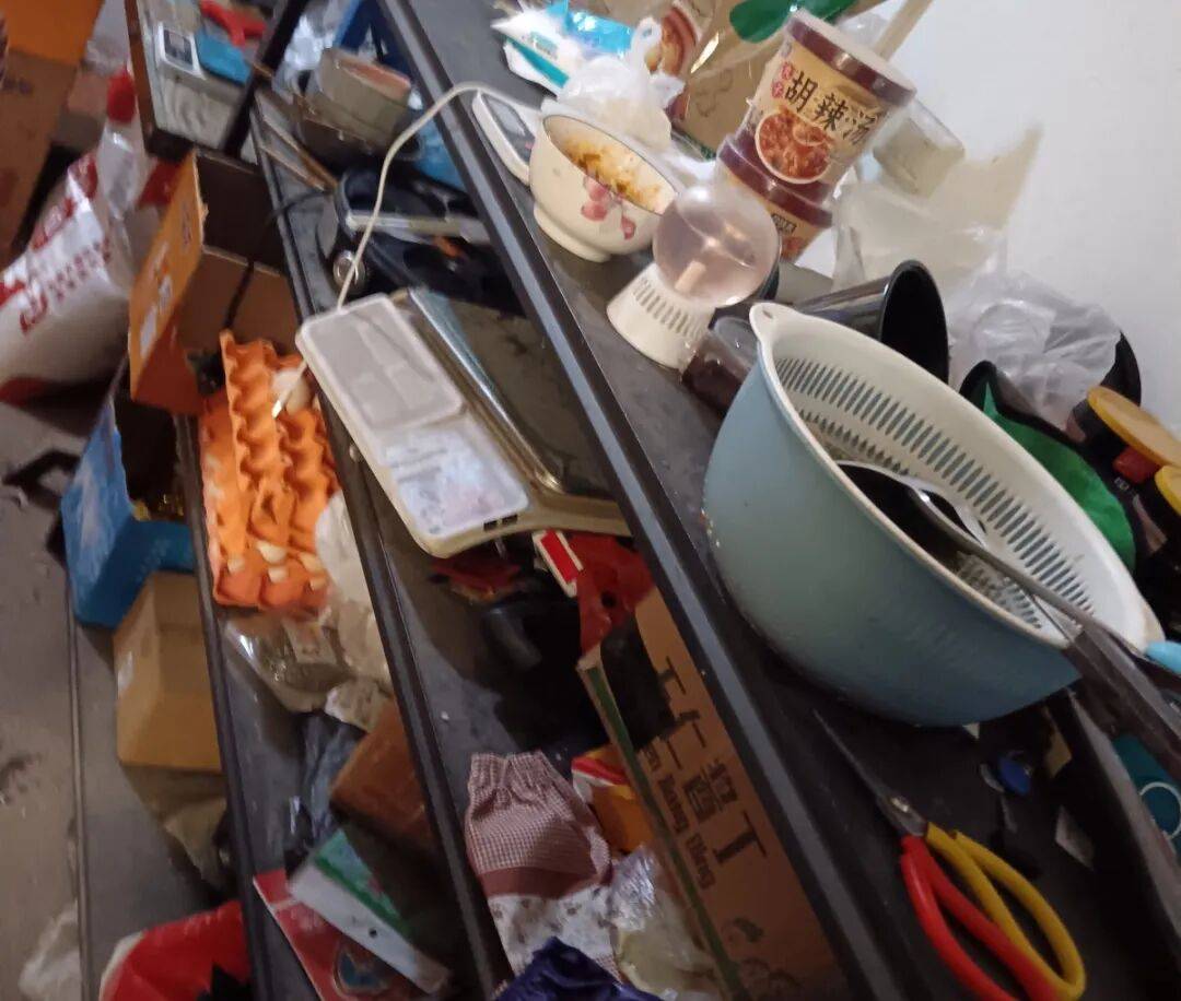 3、抽油烟机油污重;厨房内东西摆放杂乱。