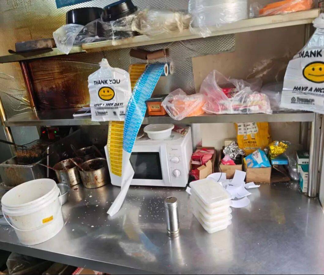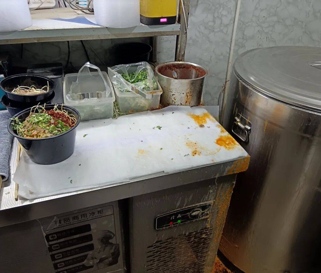 2、操作区域墙面、地面油污重,环境脏乱差,调料未加盖;