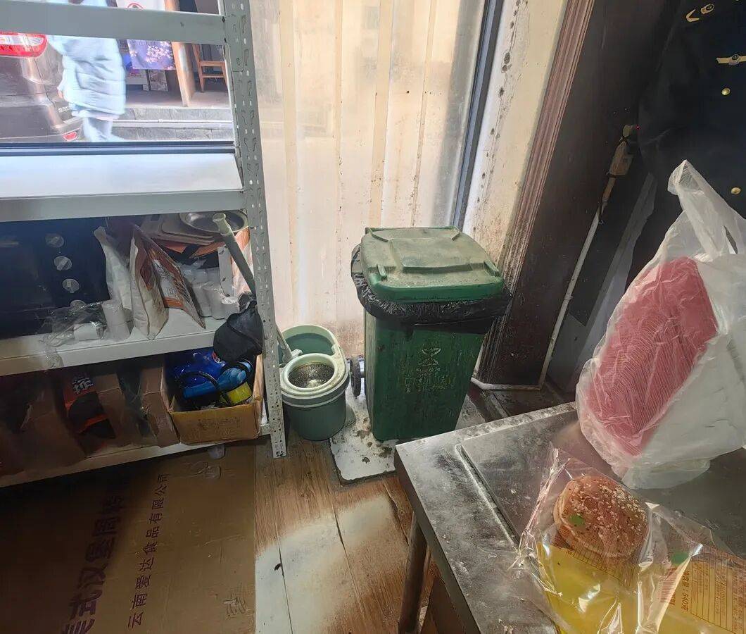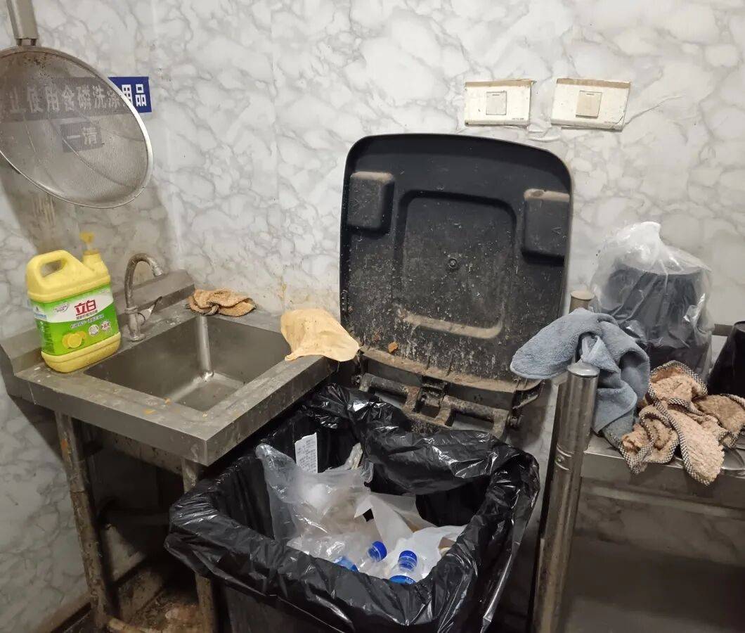1、后厨物品摆放杂乱,垃圾桶未加盖,环境脏乱差;