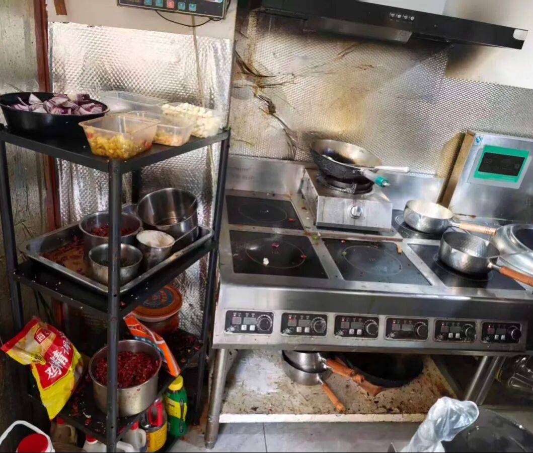 1、后厨物品摆放杂乱,抽油烟机油污重,环境脏乱差;