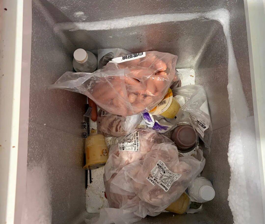 2、冰柜内食材生熟不分,堆叠摆放;