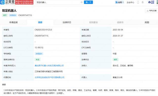 企查查APP显示,近日,魔法原子机器人科技(无锡)有限公司申请的“双足机器人”专利获授权。专利摘要显示,产品用于巡检、安防、探索、搬运、工业作业、勘察、科研、服务、教育、陪伴、娱乐、演出。