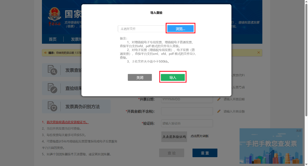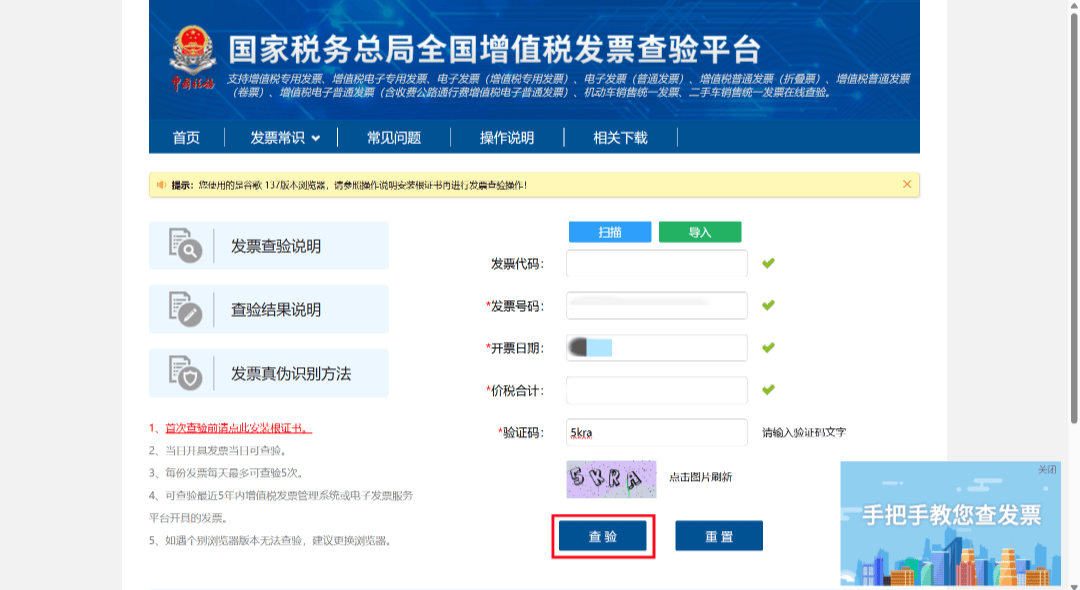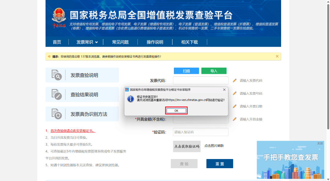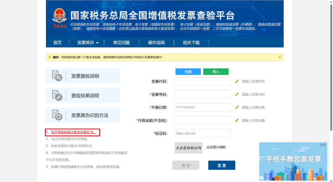 首次使用此网站查验,请按提示下载并安装根证书,安装根证书时请关闭浏览器。安装完毕后,再重新进入全国增值税发票查验平台,否则可能导致验证码无法加载。