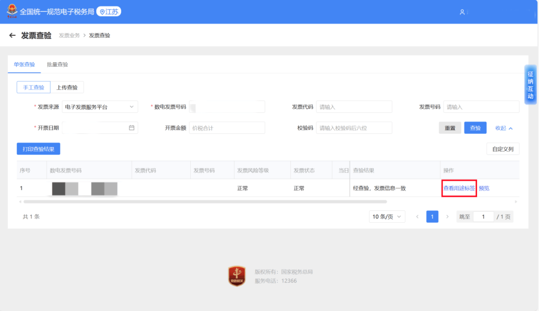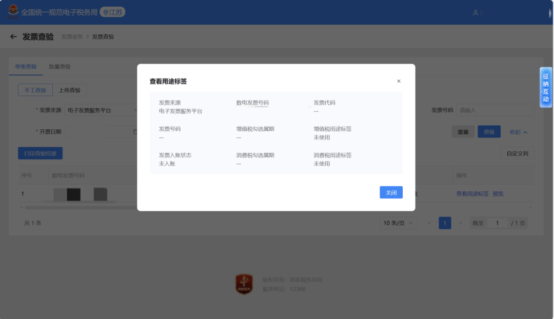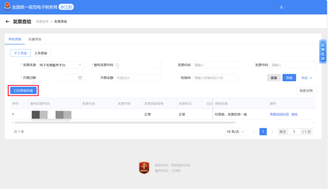 点击【打印查验结果】,会显示发票的基本信息及查验次数、查验时间、查验结果。