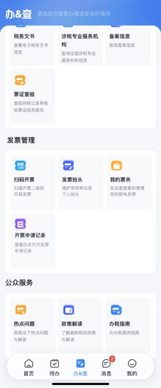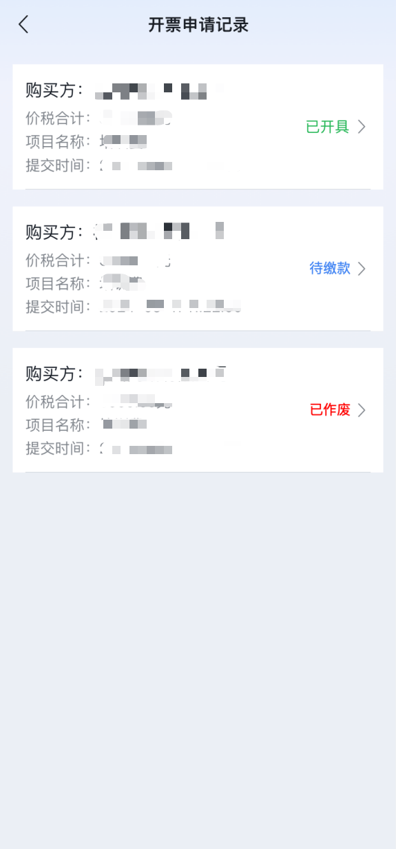 进入“办&查”频道,点击“发票管理→开票申请记录”可查看到历史待申请、待缴款、已开具、已作废等代开申请记录。点击记录信息,将进入记录详情页面,可查看具体记录信息,包括缴款信息、购买方信息、项目信息和备注信息四部分。