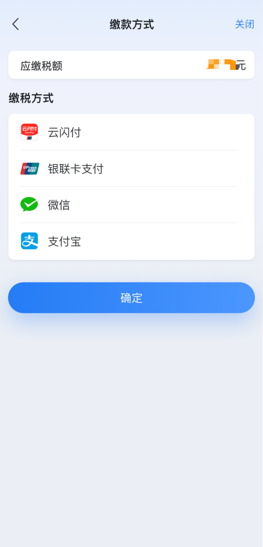 代开申请提交后,进入税款缴纳流程。选择缴款方式,通过选择的缴款支付应用完成支付后,回到个人所得税APP,确认支付结果。