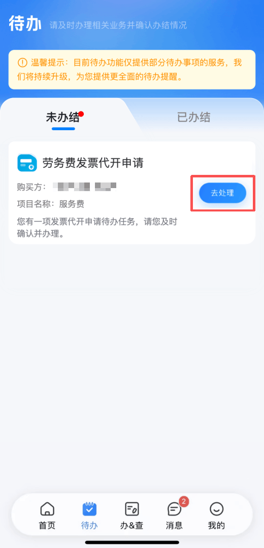 若企业已为代开申请人(销售方)发起劳务费发票代开申请信息,则代开申请人登录个人所得税APP,进入待办频道页,可查看到“劳务费发票代开申请”待办。