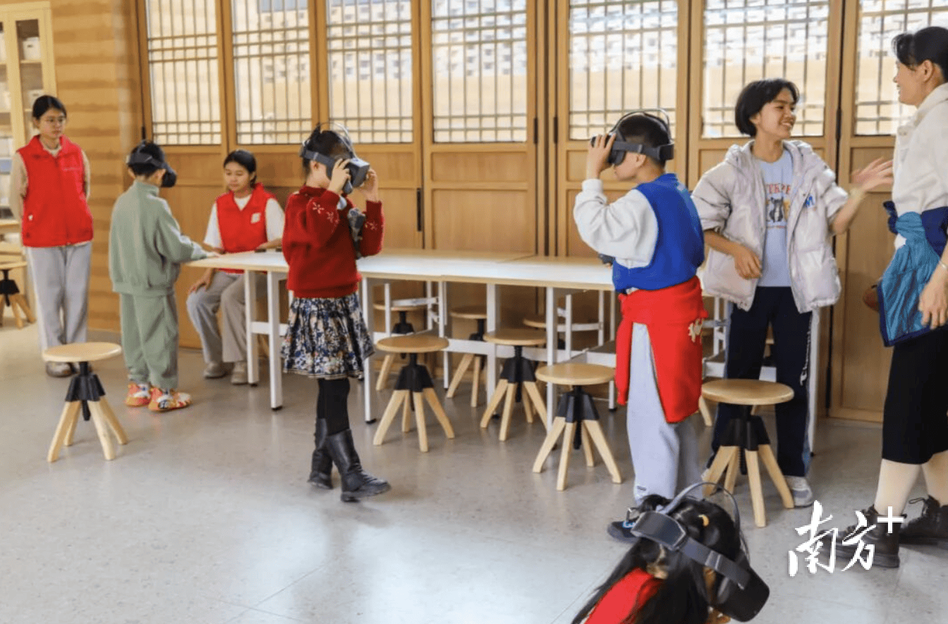 与主馆的历史沉淀感形成互补的,是毗邻的“乡创学堂”。这里设置了“AI+非遗教室”、人工智能科技中心、VR沉浸体验教室等功能空间,成为青少年开展科创实践与互动体验的场所。