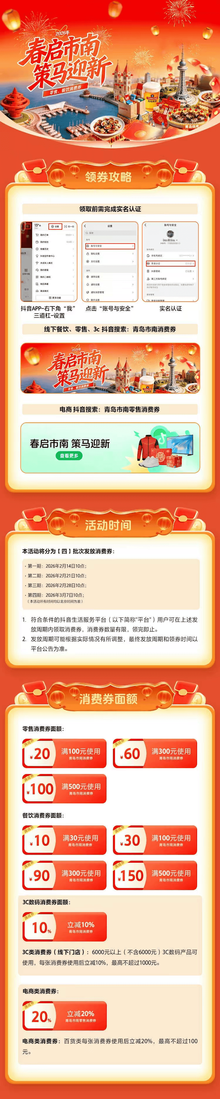领券入口:登录抖音APP搜索“青岛市南消费券”或“青岛市南零售消费券”进入活动主会场,点击“领取”即可。