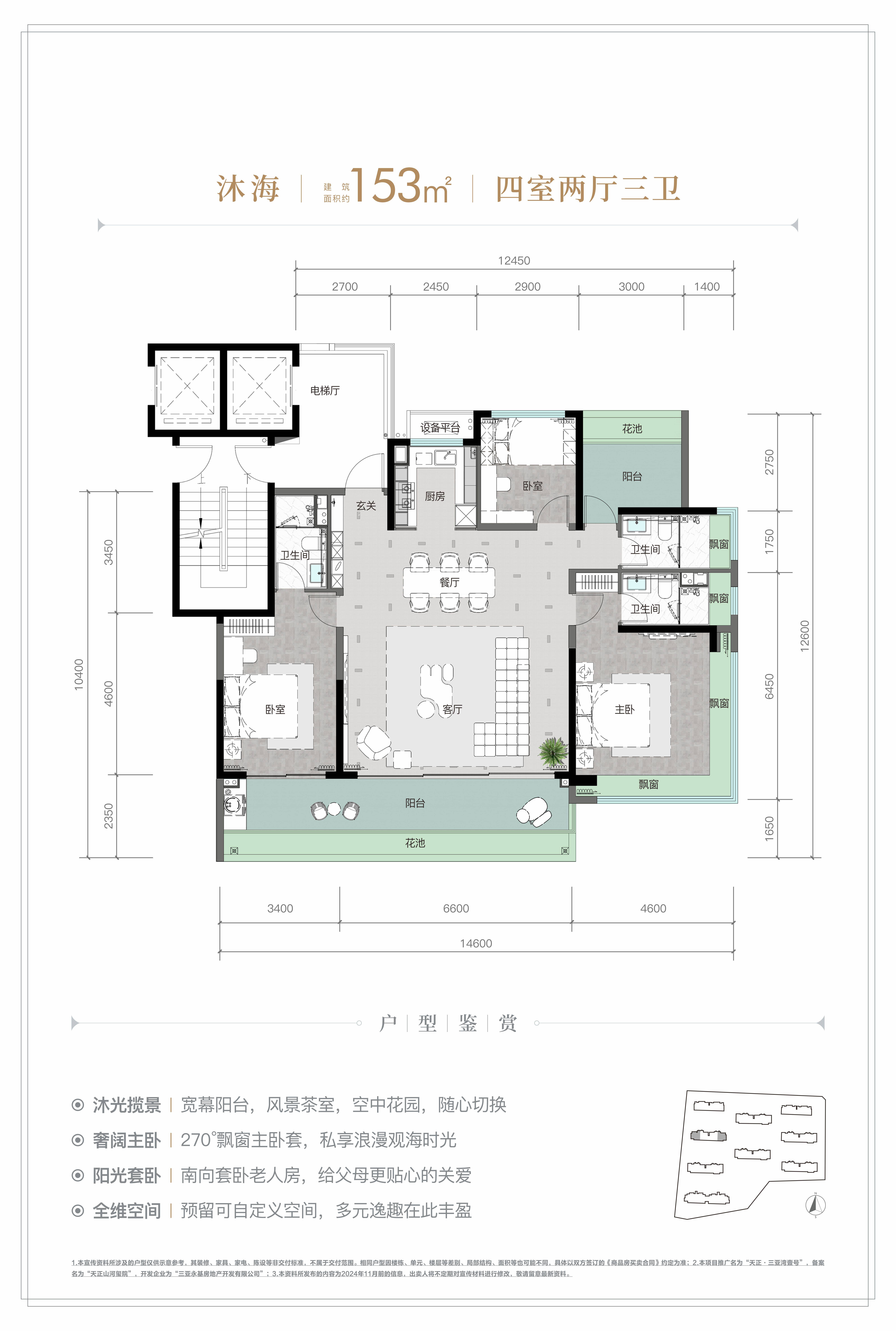 规划建筑面积约126-213㎡观海奢装大平层,约3.1米阔绰层高,部分户型创新设计270°全景飘窗主卧套、四开间朝南等,全成品高标奢装,营造全新舒居体验。