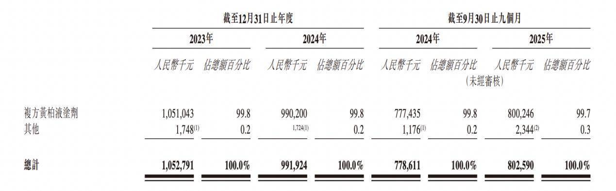 复方黄柏液涂剂为目前中国中成药领域中唯一获批的处方涂剂。其为国家二级中药保护品种,依法禁止任何其他实体生产相同药品,保护期自2023年11月起至2030年 7月止。根据弗若斯特沙利文的资料,按2024年销售收入计,复方黄柏液涂剂在中国外用中成药市场排名第四,占据1.1%的市场份额。