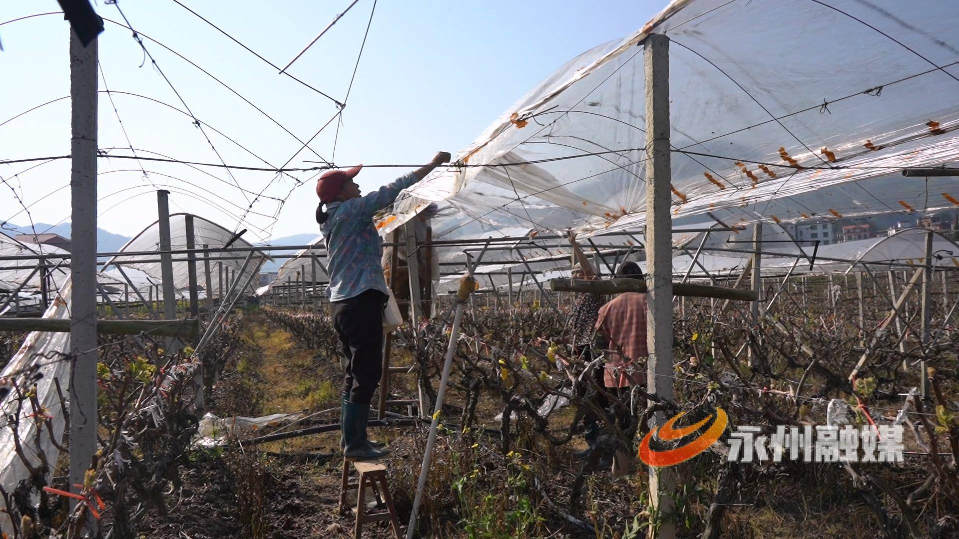 今日永州讯(蓝山特约记者 李季 肖兴康 )眼下,正值春季田间管理关键期,在蓝山县塔峰镇花果园村的葡萄种植基地内,果农们抢抓农时,开展盖膜培土、修形搭枝等各项工作,为今年葡萄产业的丰产丰收打下坚实基础。