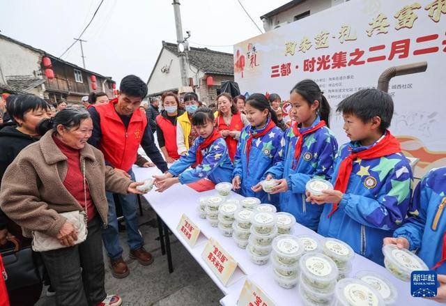 3月20日,小学生们在陶朱街道三都老街春日共富市集上分送特色炒米饭。新华社记者 徐昱 摄