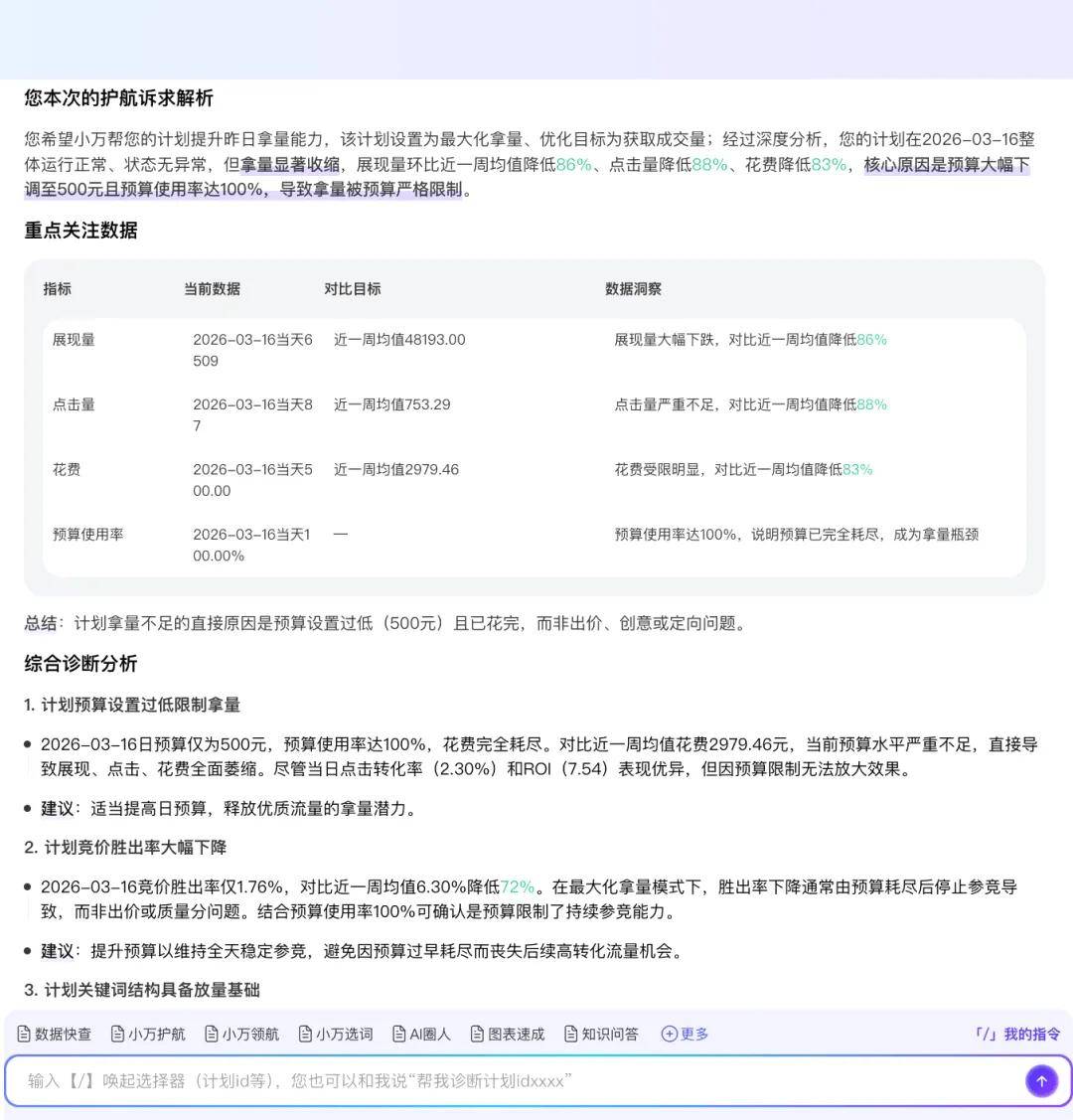 AI就又会自动查计划状态,查投放效果,给出建议。是屏蔽低转化词,还是补齐高拿量词,在盯盘报告都能看见。