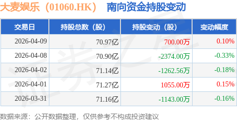 证券之星消息,4月9日南向资金增持700.0万股大麦娱乐(01060.HK)。近5个交易日中,获南向资金减持的有3天,累计净减持3024.56万股。近20个交易日中,获南向资金减持的有16天,累计净减持4.0亿股。截至目前,南向资金持有大麦娱乐(01060.HK)70.97亿股,占公司已发行普通股的23.67%。