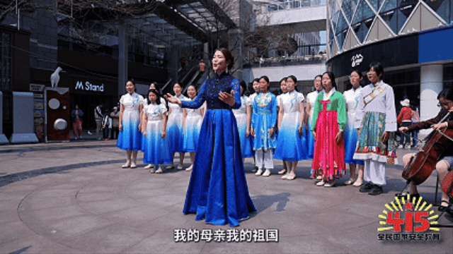 当歌者清澈的嗓音在人群中响起,旋律悠扬动人,吸引人们驻足聆听,现场气氛逐渐被点燃。随着音乐推进,身着统一服装的学生从四面汇聚,歌声此起彼伏,形成一场流动的合唱。其中,几名身着少数民族服饰的学生格外醒目,既展现多元文化,也象征各民族共同守护国家安全的力量。