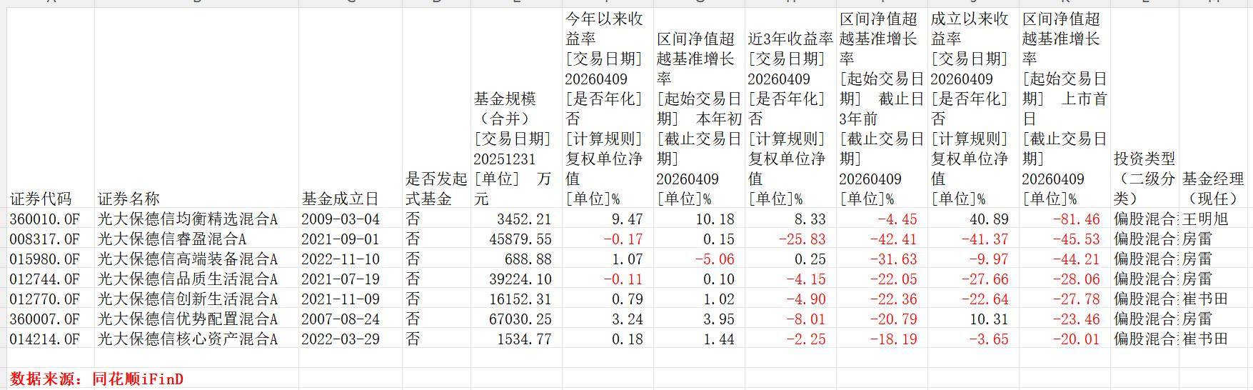 业绩方面,根据可统计数据,成立超三年(截至4月9日,下同)的33只主动权益类基金(仅统计A份额)中,有18只产品的净值表现跑输同期基准收益率10个百分点以上;其中光大保德信睿盈混合A跑输基准42个百分点,光大保德信高端装备混合A跑输近32个百分点,光大保德信消费股票A、光大保德信创新生活混合A、光大保德信品质生活混合A、光大保德信新机遇混合A与光大保德信优势配置混合A均至少跑输20个百分点。自成立至今,光大保德信均衡精选混合A、光大保德信高端装备混合A、光大保德信品质生活混合A、光大保德信核心资产混合A等7只产品至少跑输同期基准20个百分点。