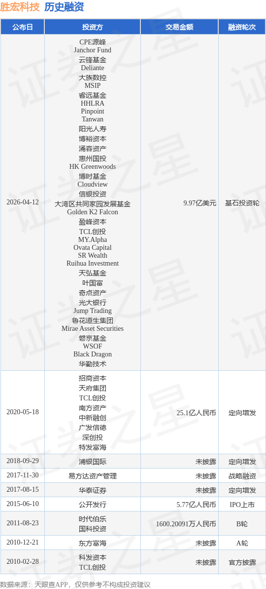 证券之星消息,根据天眼查APP于4月12日公布的信息整理,胜宏科技(惠州)股份有限公司基石投资轮融资,融资额9.97亿美元,参与投资的机构包括CPE源峰,Janchor Fund,云锋基金,Deliante,大族数控,MSIP,睿远基金,HHLRA,Pinpoint,Tanwan,阳光人寿,博裕资本,涌容资产,惠州国投,HK Greenwoods,博时基金,Cloudview,信银投资,大湾区共同家园发展基金,Golden K2 Falcon,盈峰资本,TCL创投,MY.Alpha,Ovata Capital,SR Wealth,Ruihua Investment,天弘基金,叶国富,奇点资产,光大银行,Jump Trading,鲁花道生集团,Mirae Asset Securities,磐京基金,WSOF,Black Dragon,华勤技术。