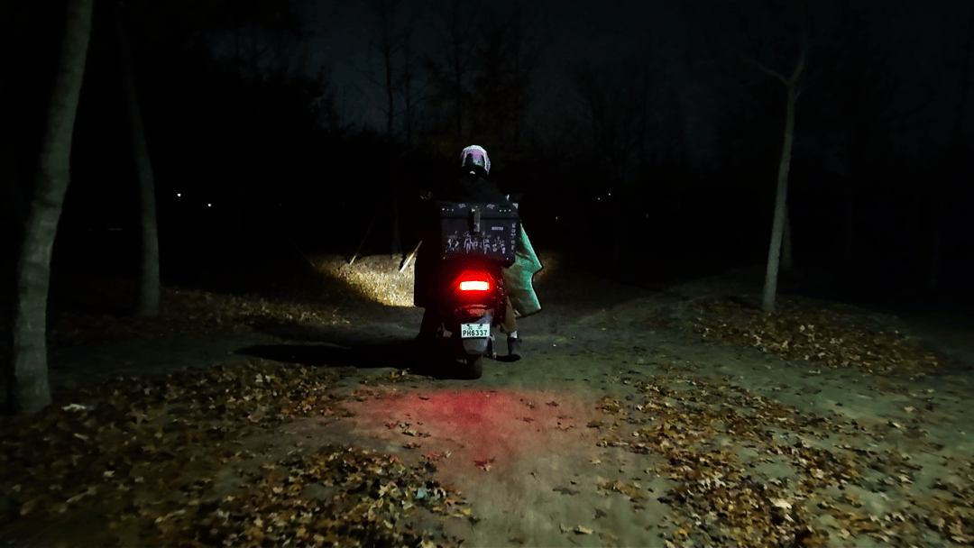 ▲夜晚送单途中,王晚穿越一片没有路灯的树林。新京报记者 吴瑜 摄