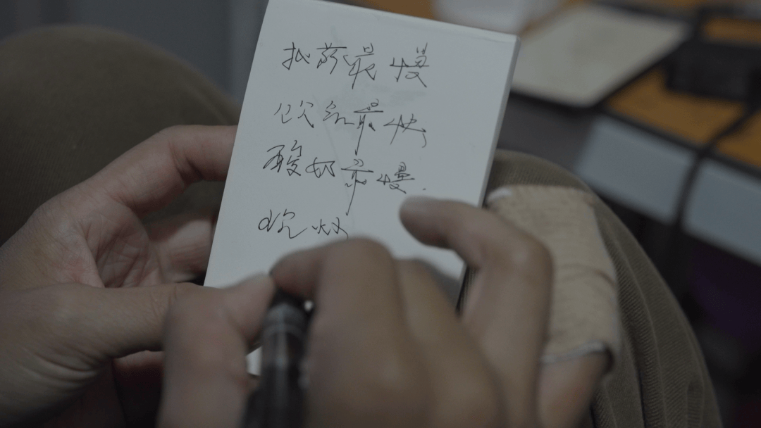 ▲王晚做笔记,写字手的小拇指在骑行中受伤。新京报记者 吴瑜 摄