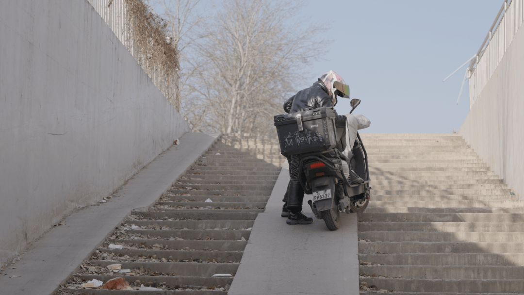 骑行过程中,最直接的障碍是不完备的基础设施。过街天桥台阶两侧的坡道陡而窄,宽度不到30厘米,没有防滑设置,但这里是外卖平台规划路线中的必经路,“好几次我都连人带车滚下去,得亏中间有个缓冲平台,否则后果不堪设想。”
