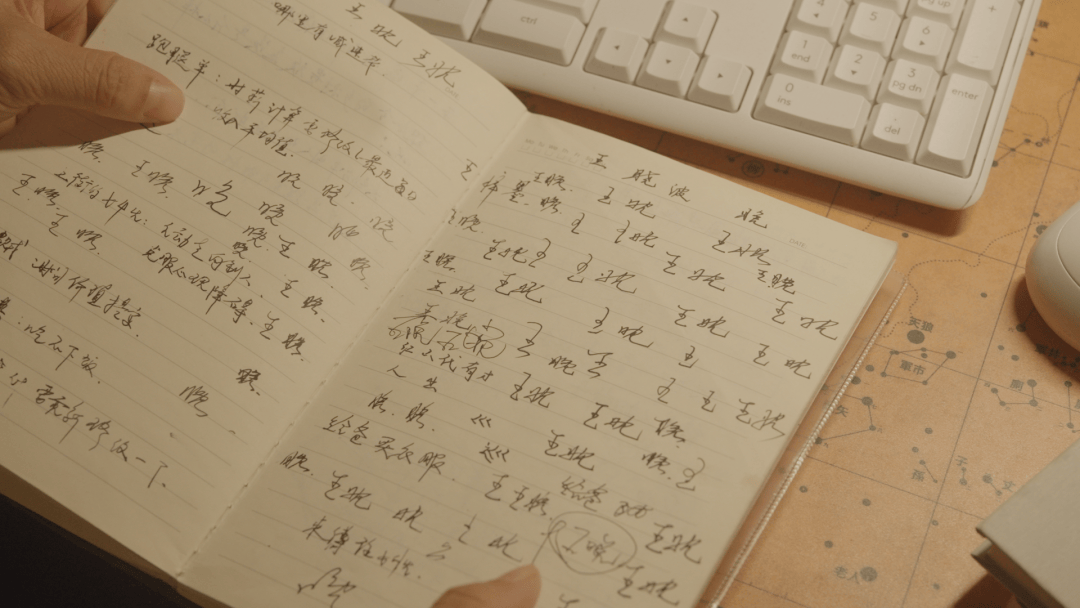 ▲《跑外卖》稿纸的中间页面,王晚练了两页签名,“万一火了呢。” 兰丹青 摄