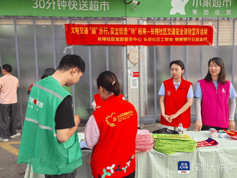 4月10日下午,深圳市宝安区石岩街道长排社区携手银座银行和新睿思早教托育中心在小象超市、叮咚买菜配送网点开展了一场特别的交通安全宣传活动。与以往不同,30余名外卖骑手接过“交通安全志愿者”袖标,从配送员转变为社区交通安全“合伙人”。