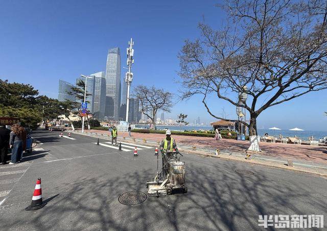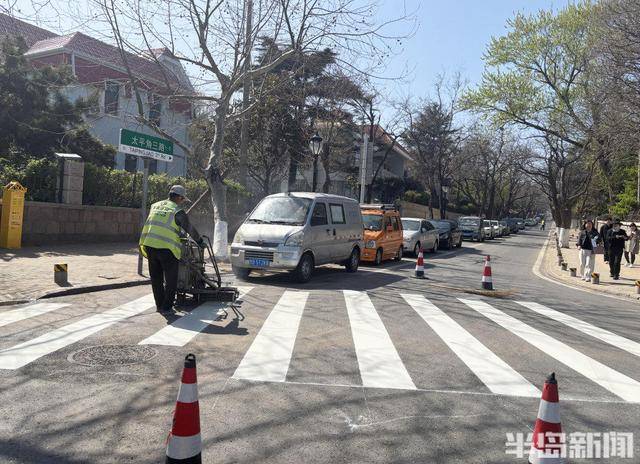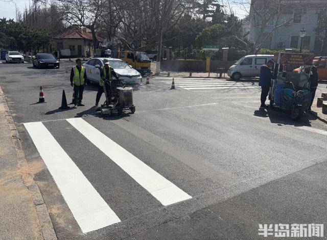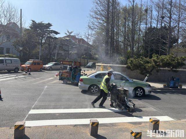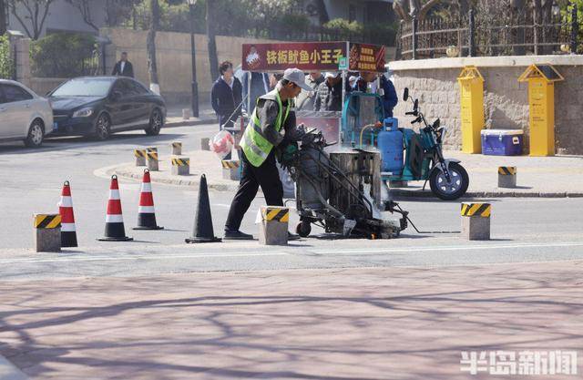 4月13日,在青岛市南区太平角三路上,施工人员正对路面模糊不清的交通标线进行重新施划,重点对沿线主要路口的斑马线逐一排查、规范翻新。临近旅游旺季,这里地处八大关风景区与第三海水浴场之间,清晰规整的交通标线既能方便游客安全出行,也能保障车辆有序通行。