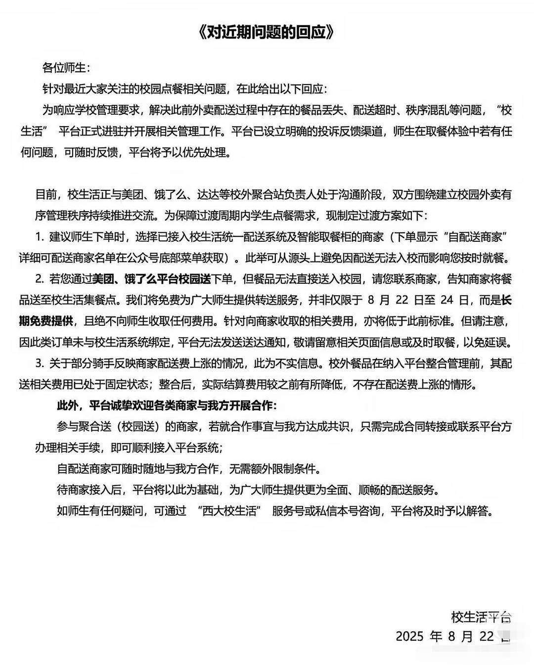 但是,“校生活”平台发布的两则公告并未打消学生和网友们的质疑。8月25日,西南大学学生工作处也发布了“关于规范校园外卖配送管理的温馨提示”,再次将上述情况进行了阐述。