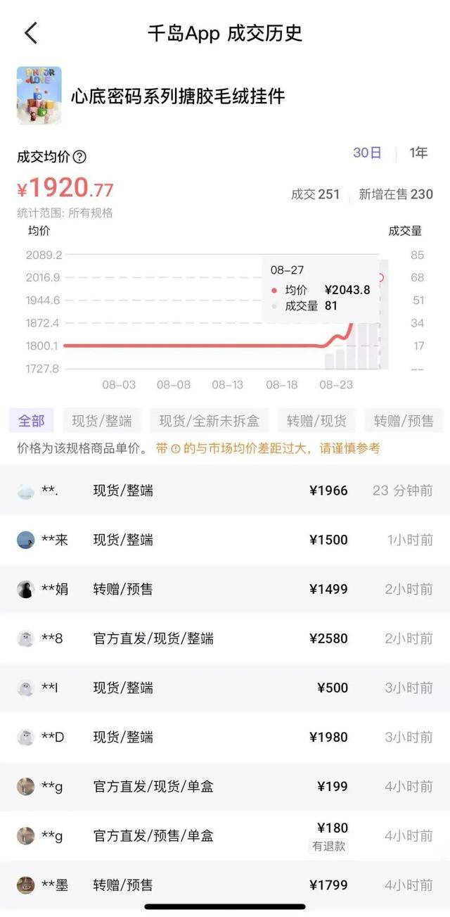 与此同时,在潮玩二手交易平台已有700余件迷你版LABUBU“在售”,已成交251件,截至发稿,成交均价为1920.77元。而在今日下午,有用户以2580元成交整端。在平台“求购”的用户出价中,用户愿意为整端盲盒付费的价格在1300元至2150元不等。