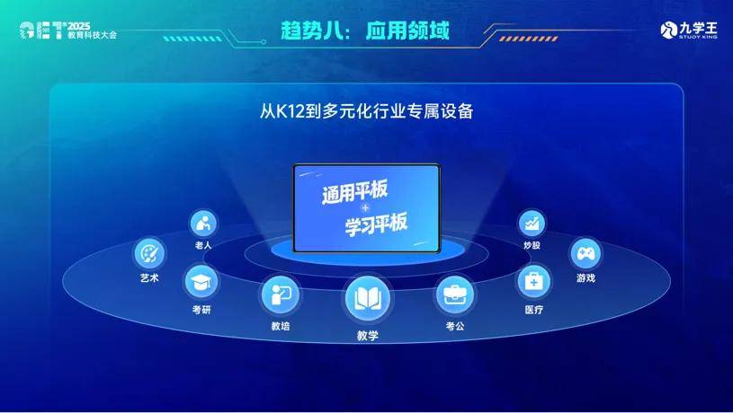我们再看一下应用的领域,可以看到,从K12已经到多元化专属的设备,以学习平板为例,从原来的通用平板到学习平板,只是一个K12领域的应用。我们今年已经陆续出来了各种各样的学习终端,我们有考公的,有炒股的,我们也有成人学习类的,出了一款学习设备。可以预见在不久的将来,专业的学习终端,一定会延伸到各行各业,形成一个专属的学习终端。专属的学习终端会远远超越我们原来所谓的手机也好,通用平板也好,因为我们可以结合AI的技术,让它变成一个更加专业、更加封闭、更加垂类的学习设备。