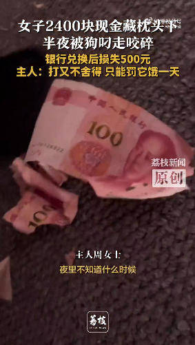 近日,江西南昌的周女士将2400元现金用袋子系紧后压在枕头下,不料半夜被家中宠物狗叼走并咬碎。