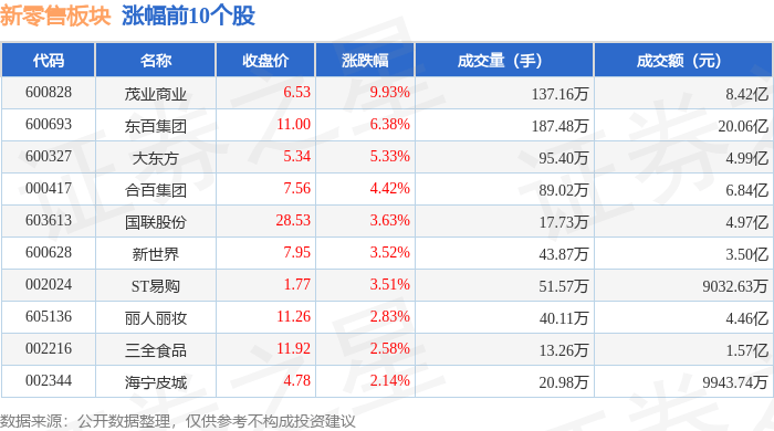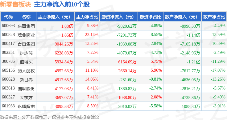 从资金流向上来看,当日新零售板块主力资金净流入1.03亿元,游资资金净流出1.46亿元,散户资金净流入4292.43万元。新零售板块个股资金流向见下表: