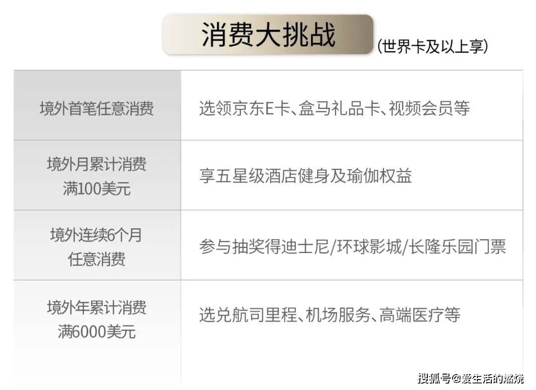境外月累计消费满100美元:可享五星级酒店健身及瑜伽权益(其中世界卡次月5次、世界之极卡次月8次)。