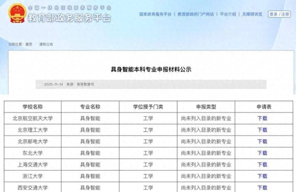 11月14日,教育部网站发布《具身智能本科专业申报材料公示》。