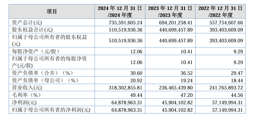 业绩方面,2022年至2024年(下称“报告期”),公司分别实现营收2.42亿元、2.36亿元、3.18亿元,归母净利润为5715万元、4590.41万元、6487.9万元。其中,2023年公司营收、归母净利润同比双双下滑,降幅分别为2.48%、19.68%。
