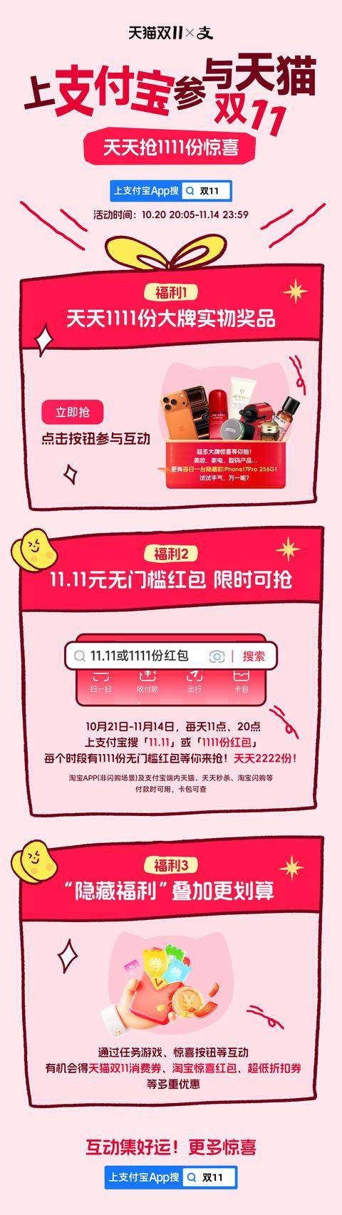 消费者通过支付宝搜索“双11”即可进入页面参与“大牌实物天天抽”活动,每日有机会获取iPhone17 Pro、雅诗兰黛眼霜等1111份实物奖品。自10月21日起,每日11点与20点还可抢11.11元无门槛红包,并可通过任务游戏获取消费券、折扣券等额外福利。
