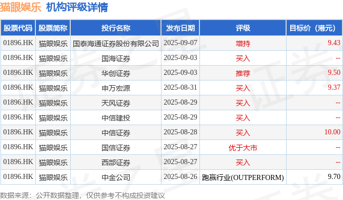 投行对该股的评级以买入为主,近90天内共有6家投行给出买入评级,近90天的目标均价为9.6港元。国泰海通证券股份有限公司最新一份研报给予猫眼娱乐增持评级,目标价9.43港元。