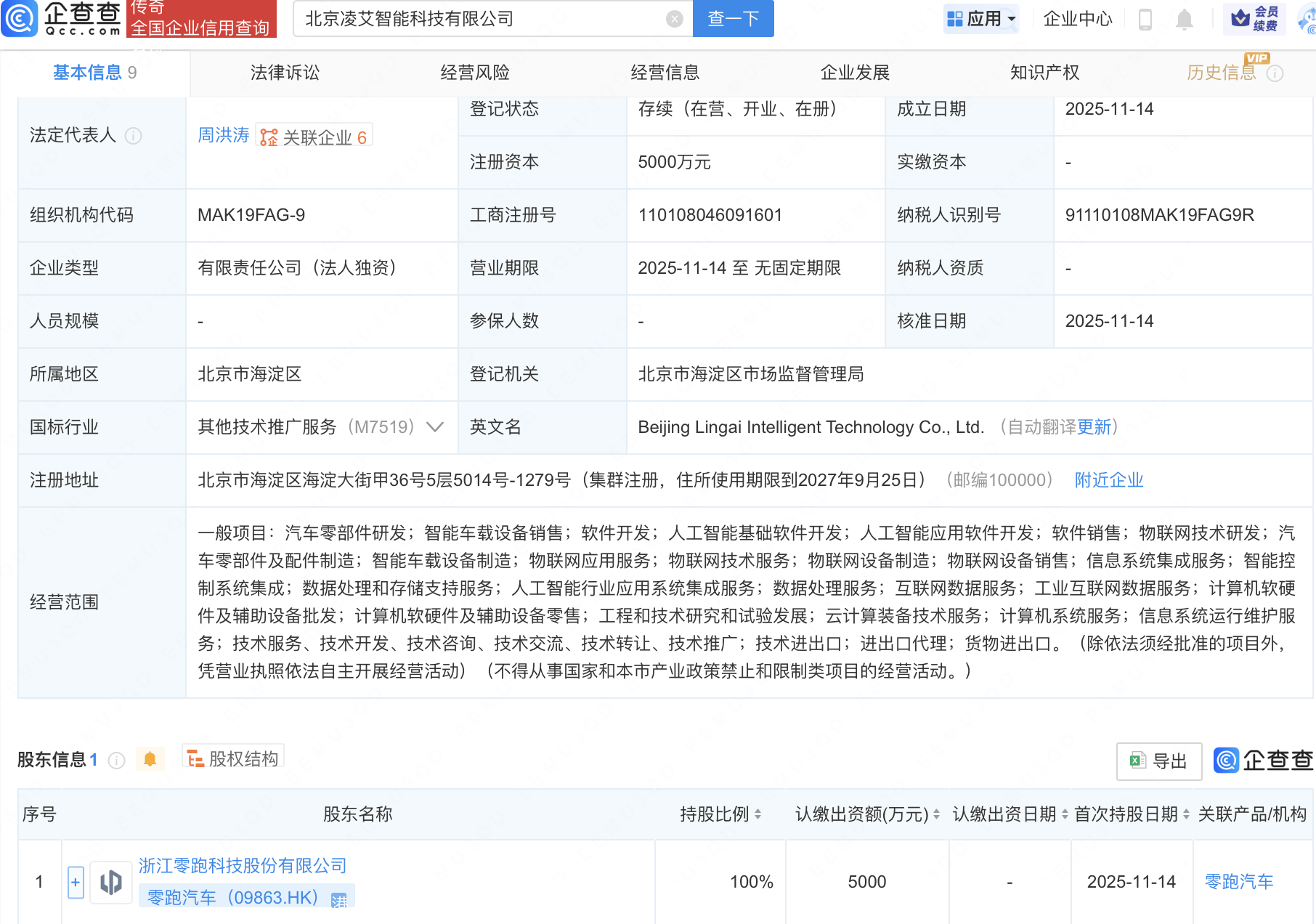 企查查APP显示,近日,北京凌艾智能科技有限公司成立,注册资本5000万元,经营范围包含:人工智能基础软件开发;人工智能应用软件开发;物联网应用服务;物联网技术服务等。企查查股权穿透显示,该公司由零跑汽车(09863.HK)全资持股。