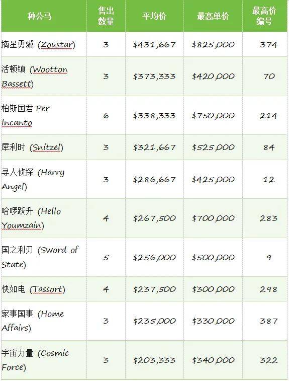 蓝斯当公园(Landsdowne Park)以4匹售出马匹均价277,500新币(折合人民币约112万元)成为均价最高供应商;“至高无极”(I Am Invincible)则以三匹子嗣均价431,667新币(折合人民币约174万元)成为均价最高种公马。