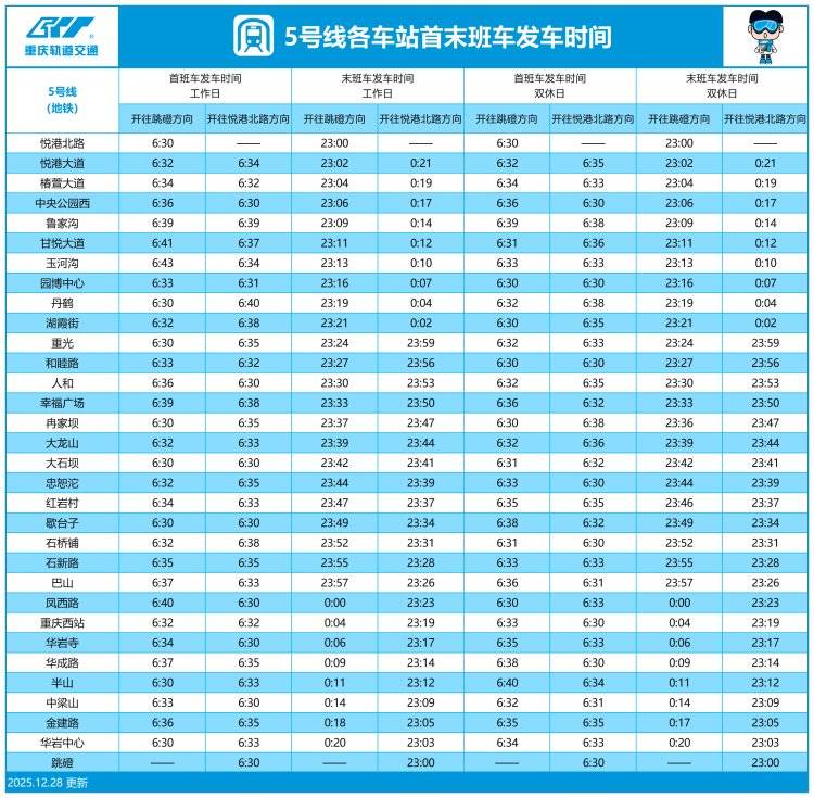 12月27日,重庆交通开投集团轨道运营公司发布消息,为更好满足市民出行需求,轨道交通5号线将于12月28日(周日)起优化运营组织。