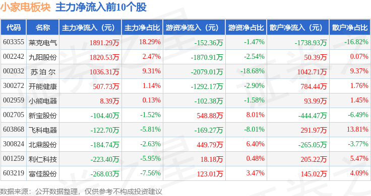 从资金流向上来看,当日小家电板块主力资金净流出5518.73万元,游资资金净流出1760.45万元,散户资金净流入7279.17万元。小家电板块个股资金流向见下表: