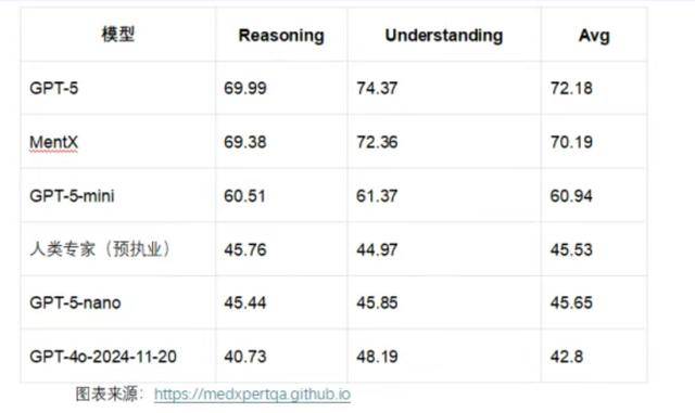 评测结果显示,MentX在“多模态推理”和“医学理解”两项核心指标上分别取得69.38%和72.36%,综合得分达70.19%,仅次于GPT-5,且大幅领先于GPT-4o、GPT-5-mini及人类预执业专家水平。MentX实现对国际主流模型的超越,展现出中国企业在医疗人工智能领域的重要技术突破。
