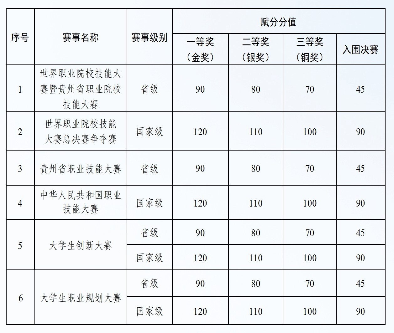 2.同一赛项,按获奖最高级别赋分,分值不累加;多个赛项获奖,只选取赋分分值最高赛项赋分,分值不累加。